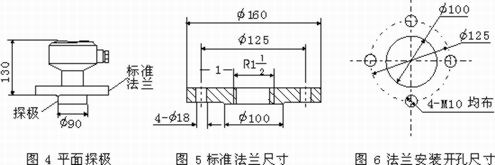 3、平面探极为法兰安装(法兰安装开孔尺寸见图 6),只能侧装。