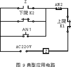 用两台物位开关将物位控制在上、下限之间的自动控制电路如图 9 所示,其中 Z为送料主控继电器,AN1为手动送料按钮,AN2 为手动停止送料按钮,K1、K2 分别为上、下限位开关的继电器输出接点。